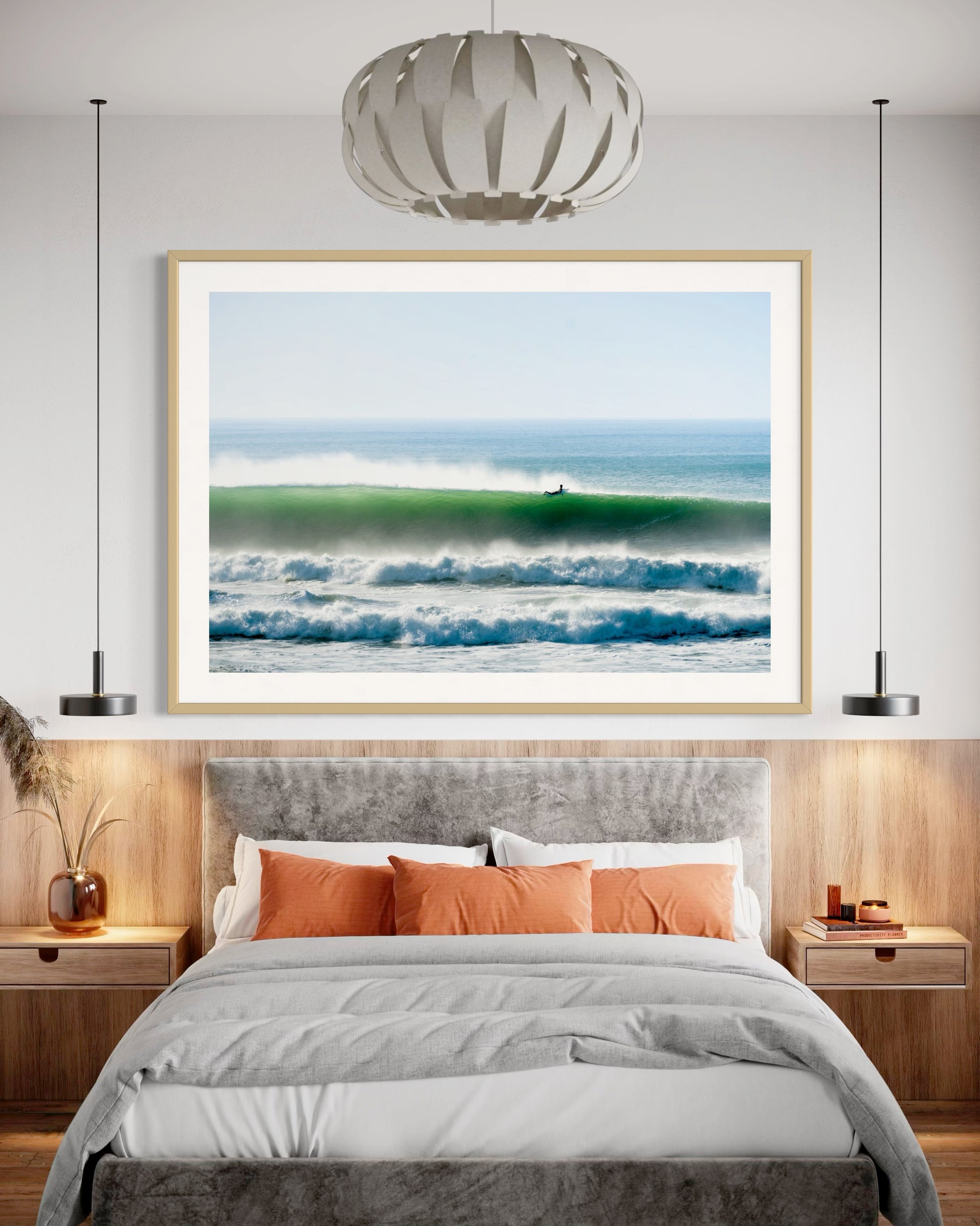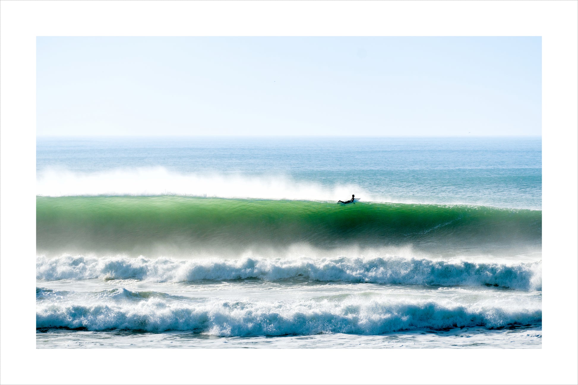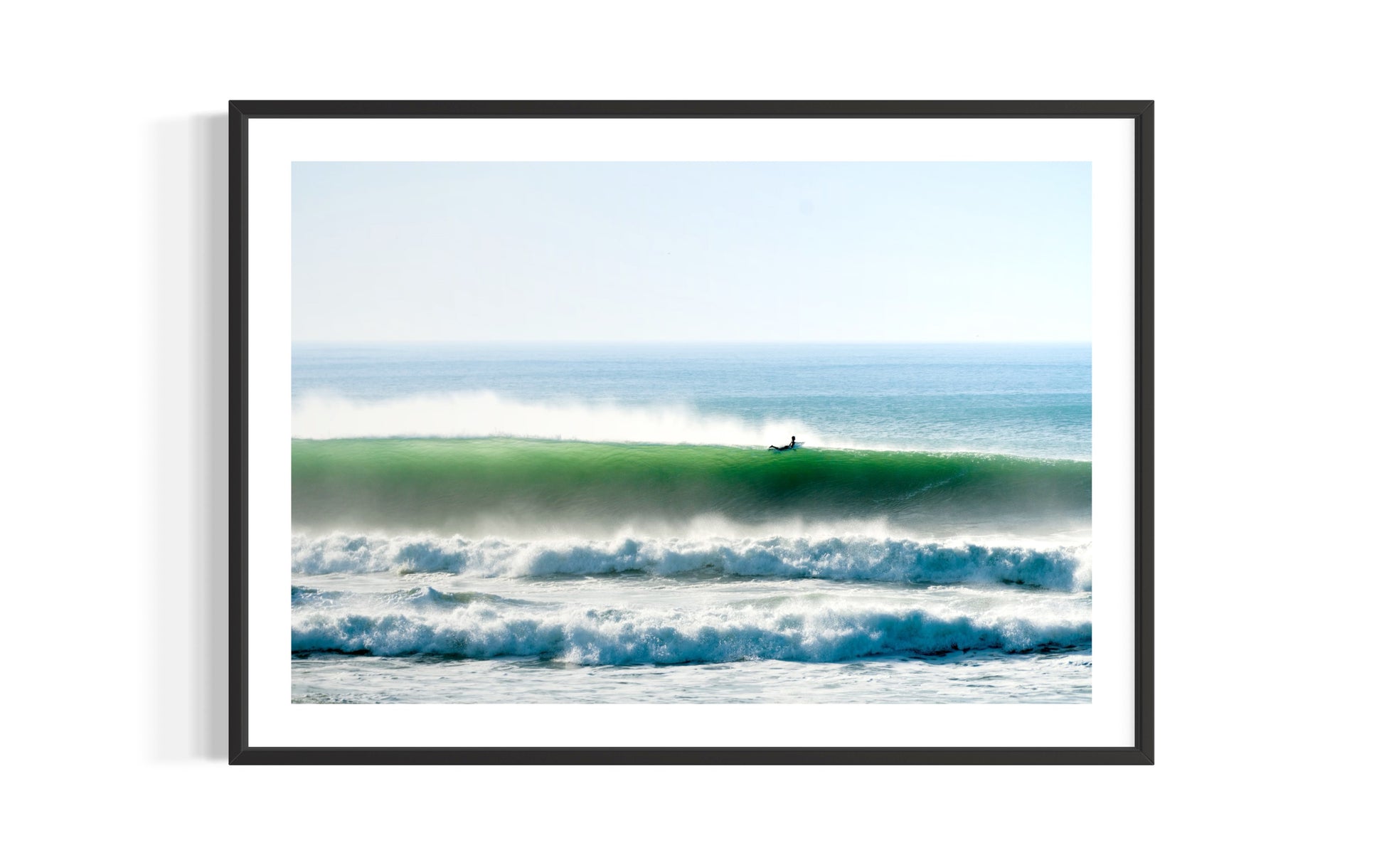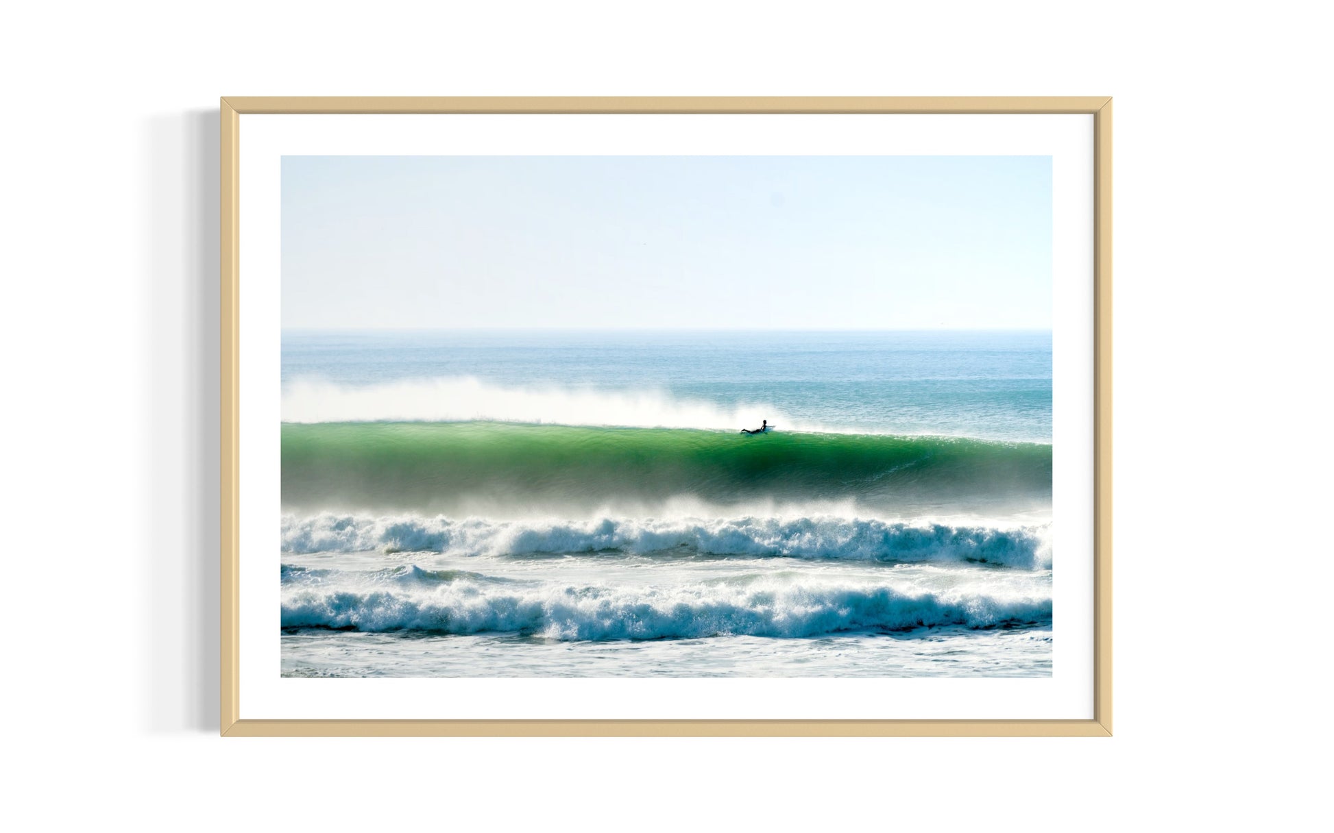 In Natural Balance is a Limited Edition of 100. It was Photographed at Ocean Beach, California. Captured on a sunny winter day with offshore winds revealing a quiet harmony between human and nature. A lone surfer paddles effortlessly over a perfectly formed set wave, suspended between power and peace, as emerald water rolls beneath a sky of soft blue.